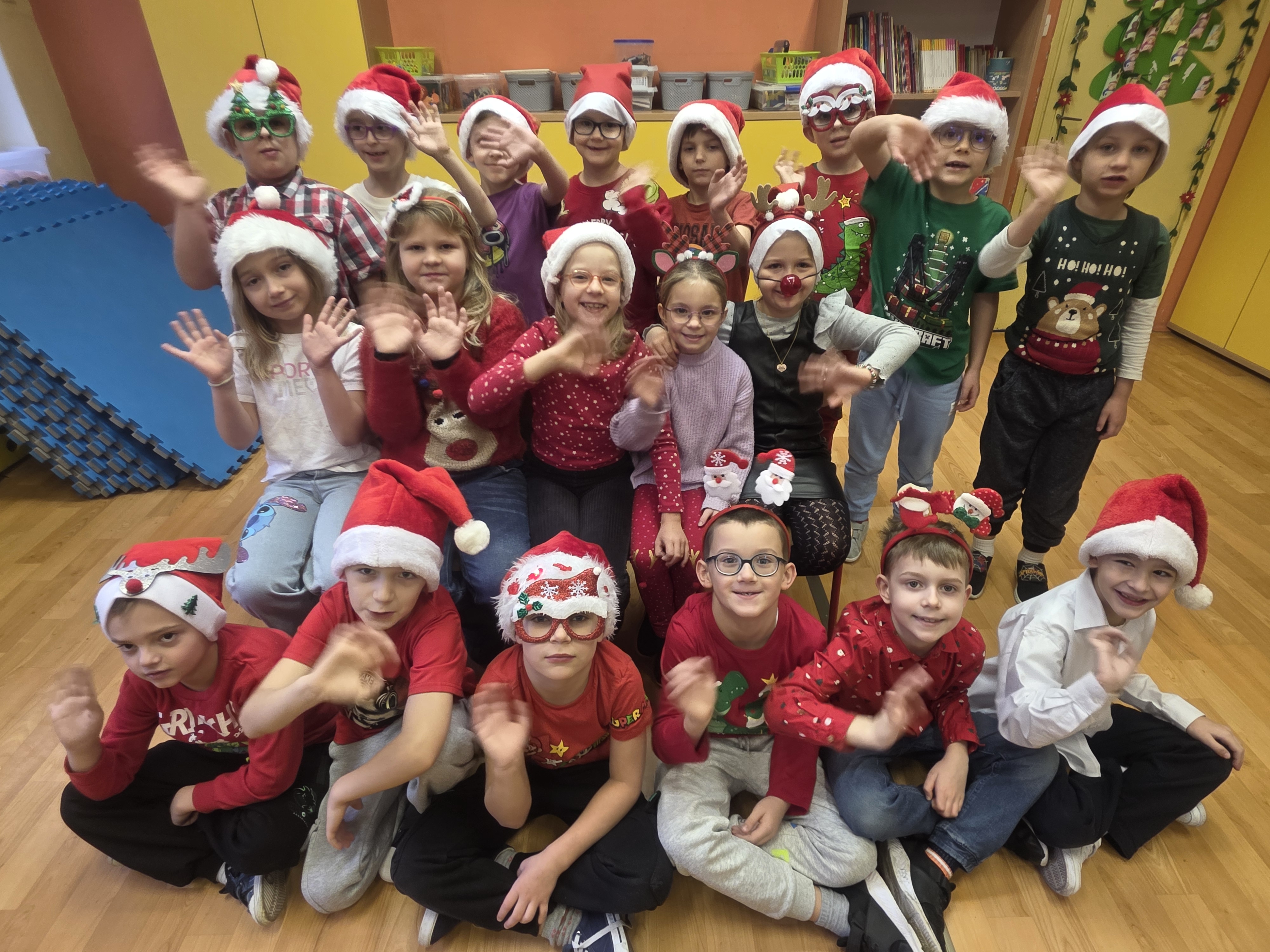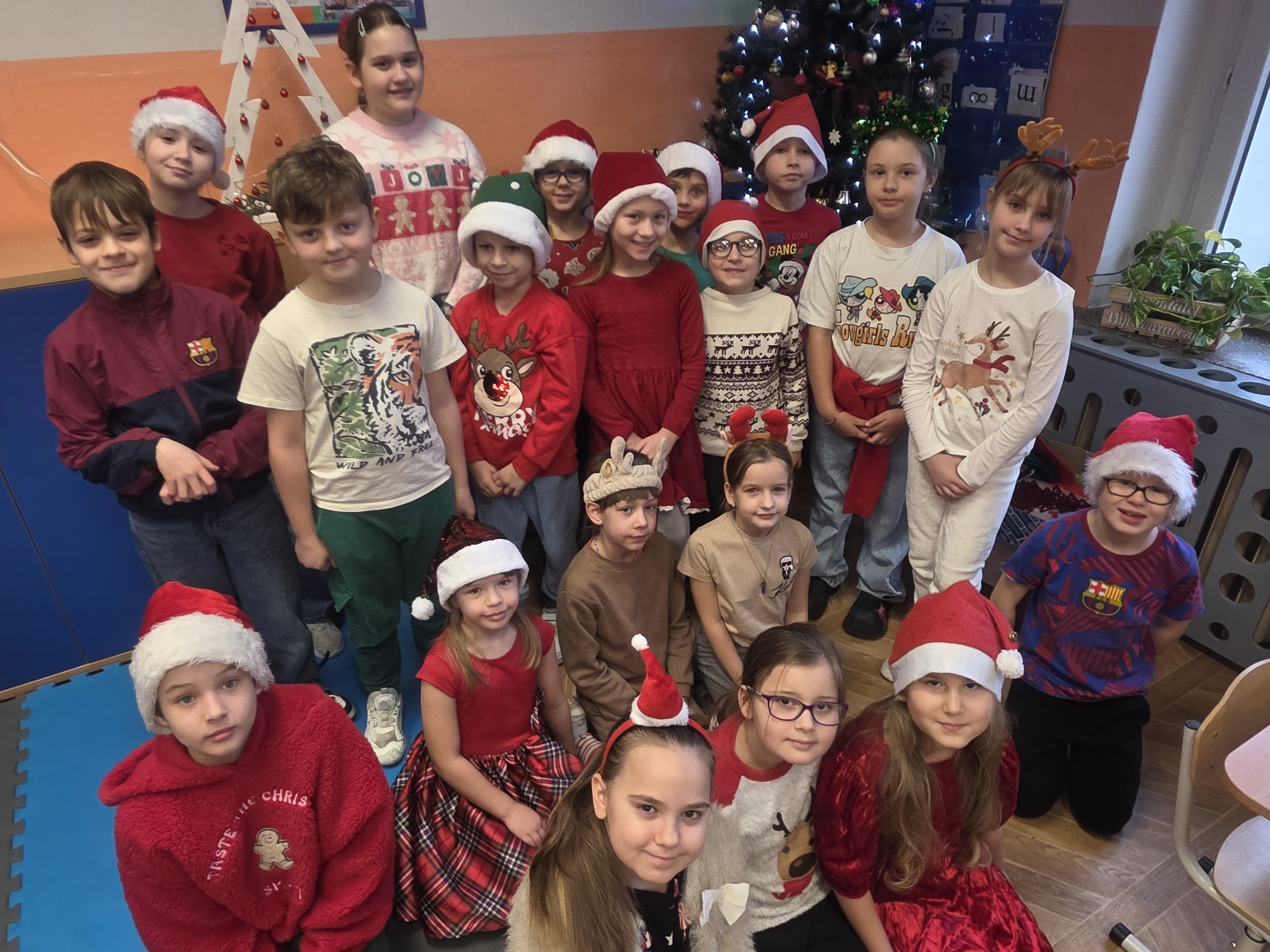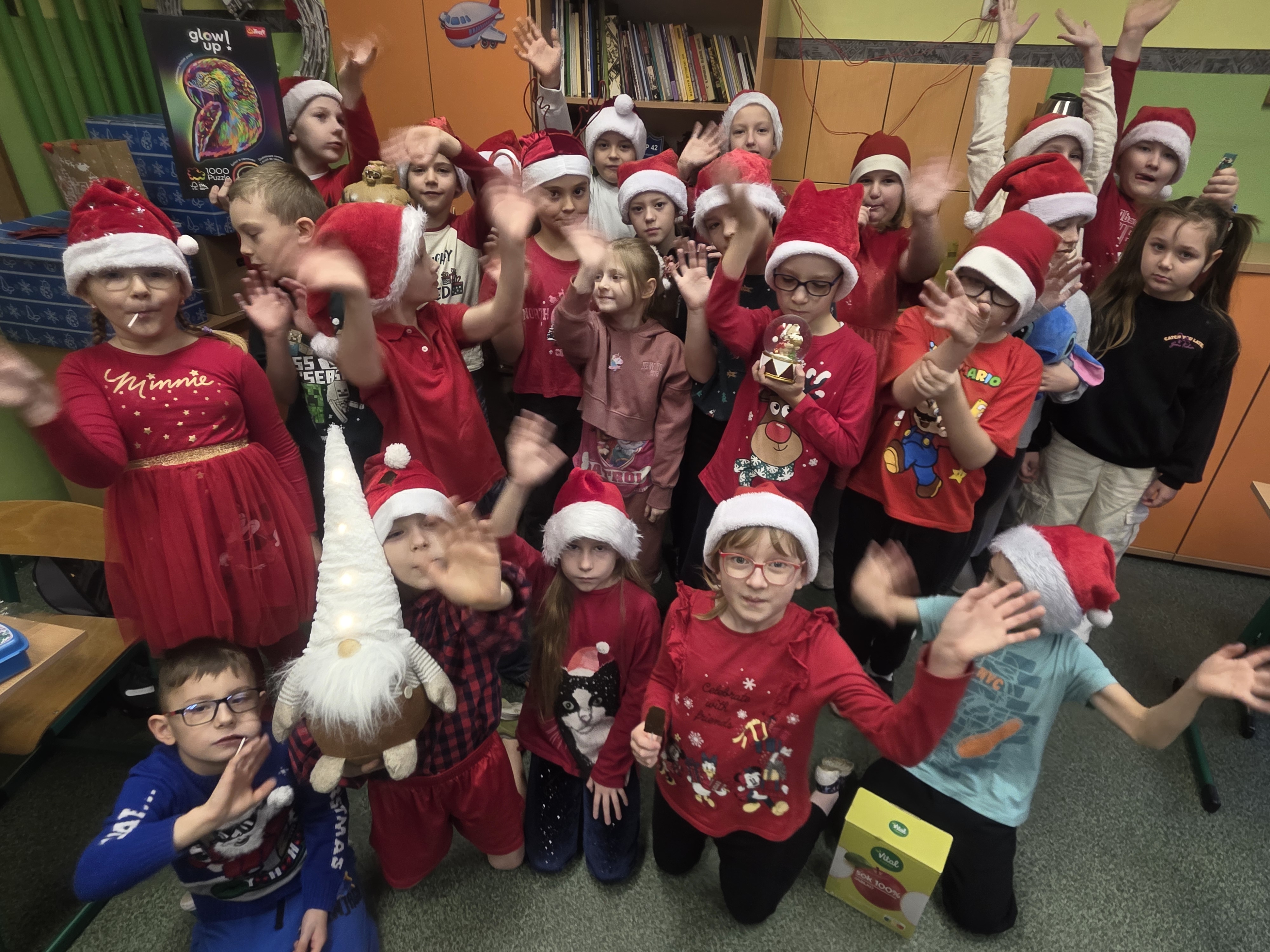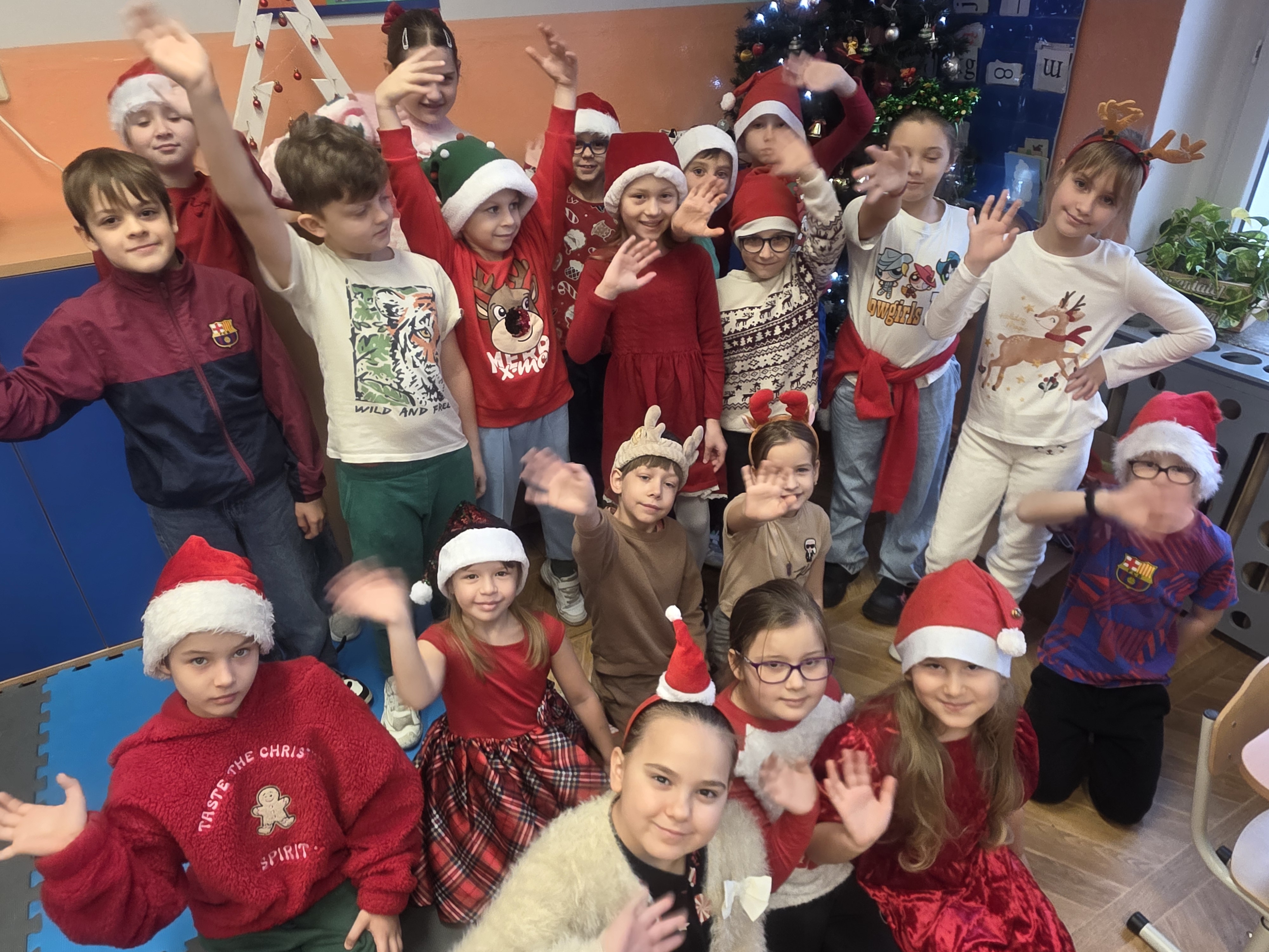 Dzieci bawiły się znakomicie – było mnóstwo uśmiechu, energii i wspólnej zabawy, a dzięki czerwonym czapkom i świątecznym akcentom św. Mikołaj na pewno nas zobaczył! Zgodnie z tradycją nie zawiódł i odwiedził nas wraz ze swoimi pomocnikami – aniołami i elfami. Jego wizyta wywołała wiele radości i zaskoczenia, a szkolne mury na chwilę zamieniły się w prawdziwą mikołajową krainę.
