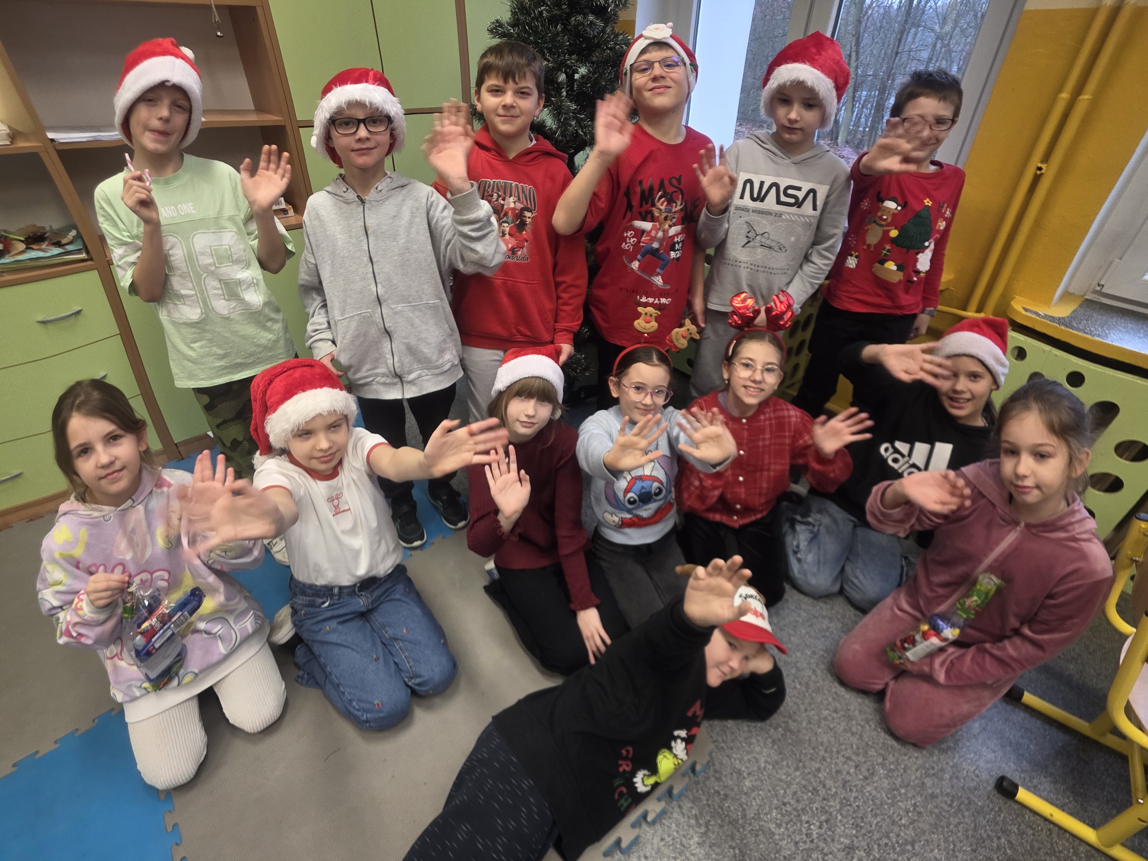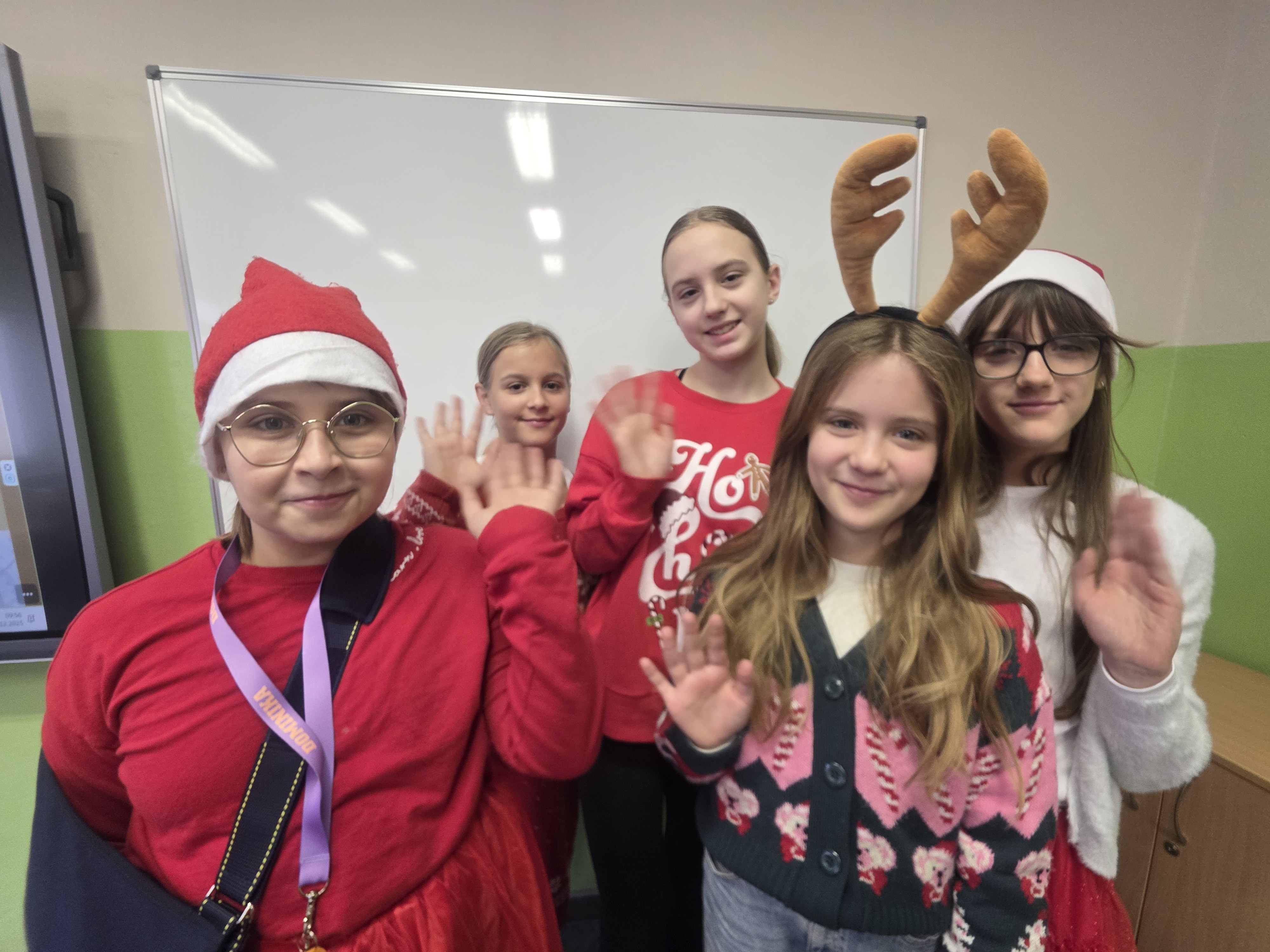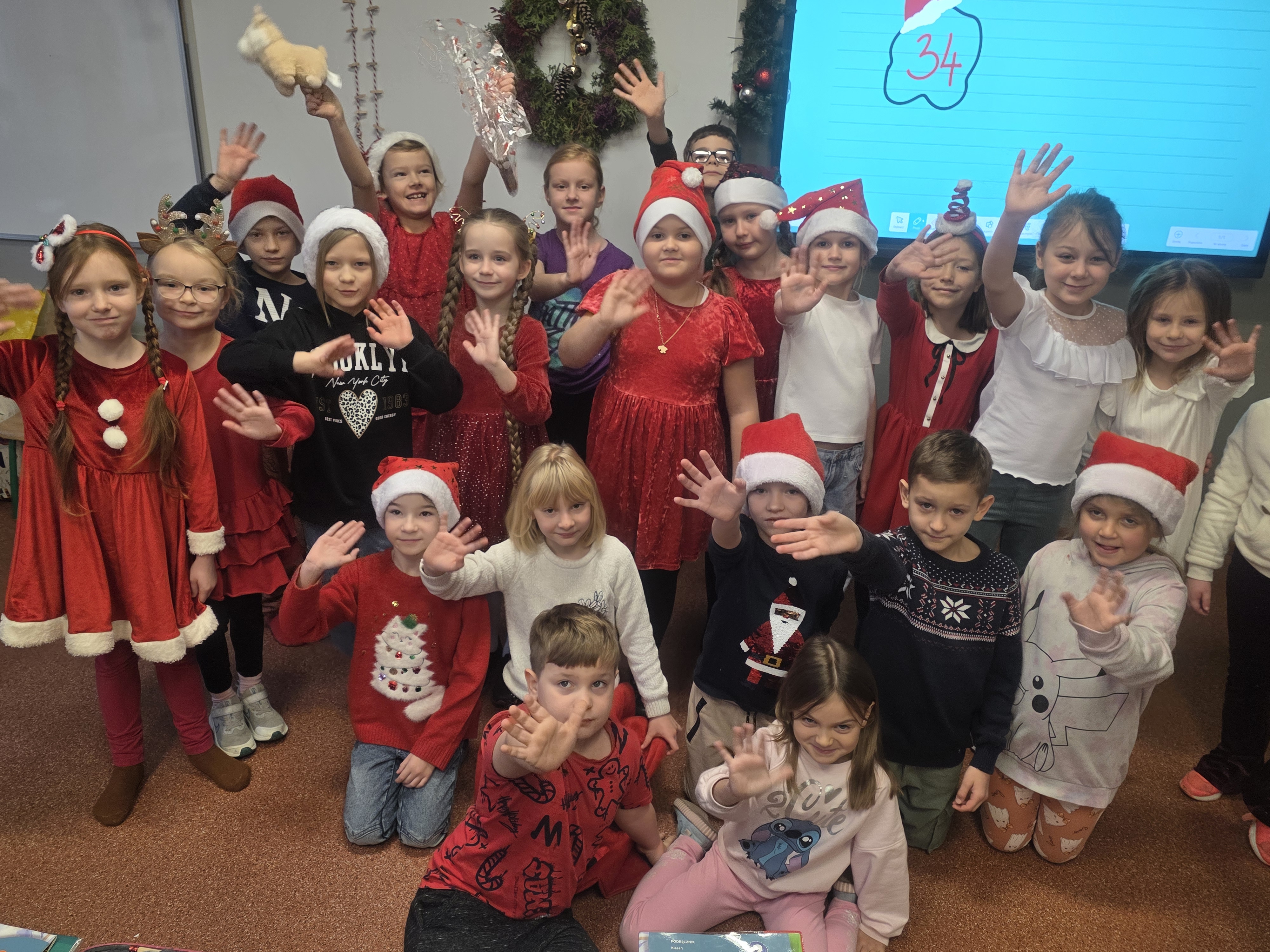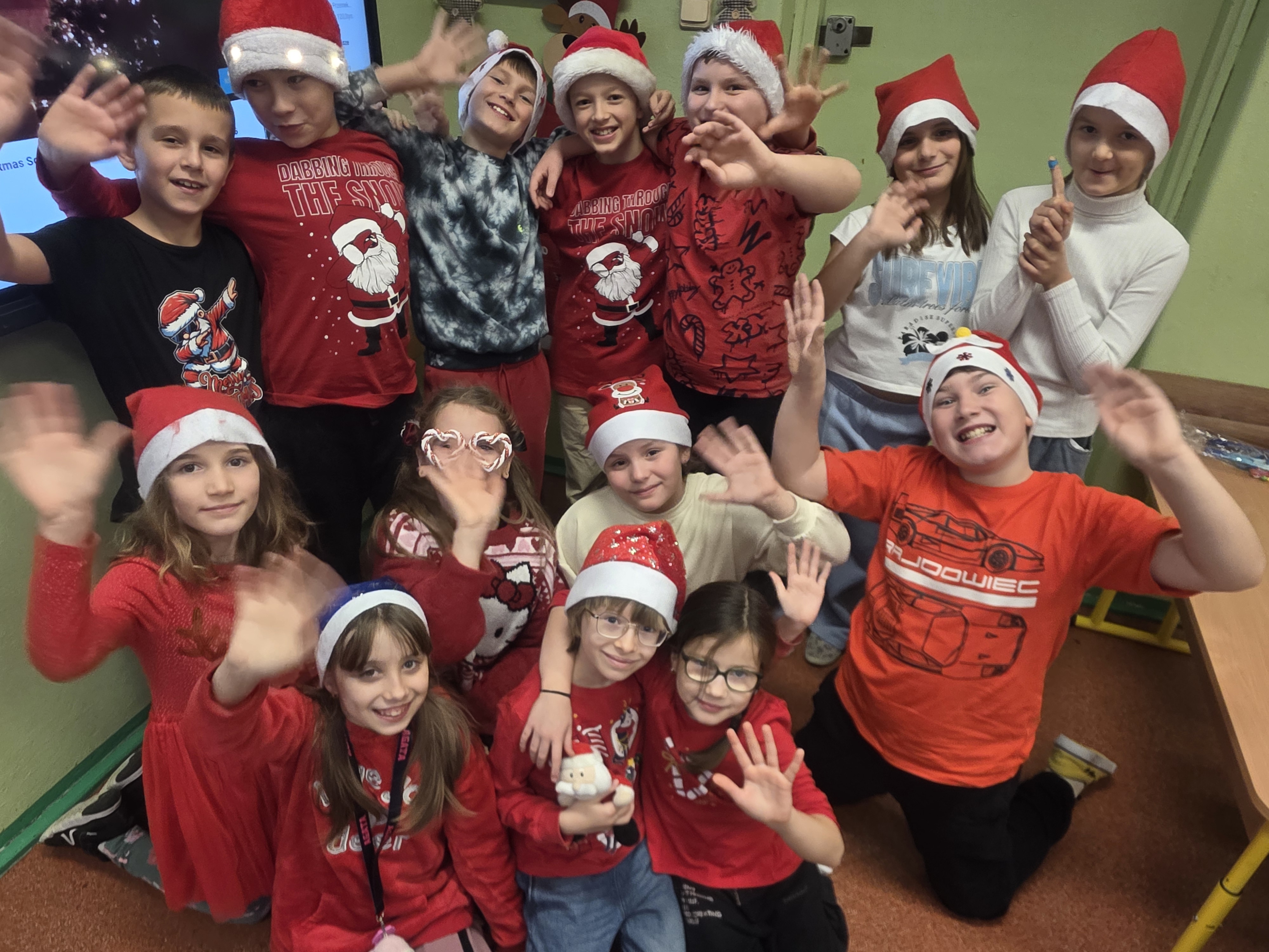 Dzieci bawiły się znakomicie – było mnóstwo uśmiechu, energii i wspólnej zabawy, a dzięki czerwonym czapkom i świątecznym akcentom św. Mikołaj na pewno nas zobaczył! Zgodnie z tradycją nie zawiódł i odwiedził nas wraz ze swoimi pomocnikami – aniołami i elfami. Jego wizyta wywołała wiele radości i zaskoczenia, a szkolne mury na chwilę zamieniły się w prawdziwą mikołajową krainę.