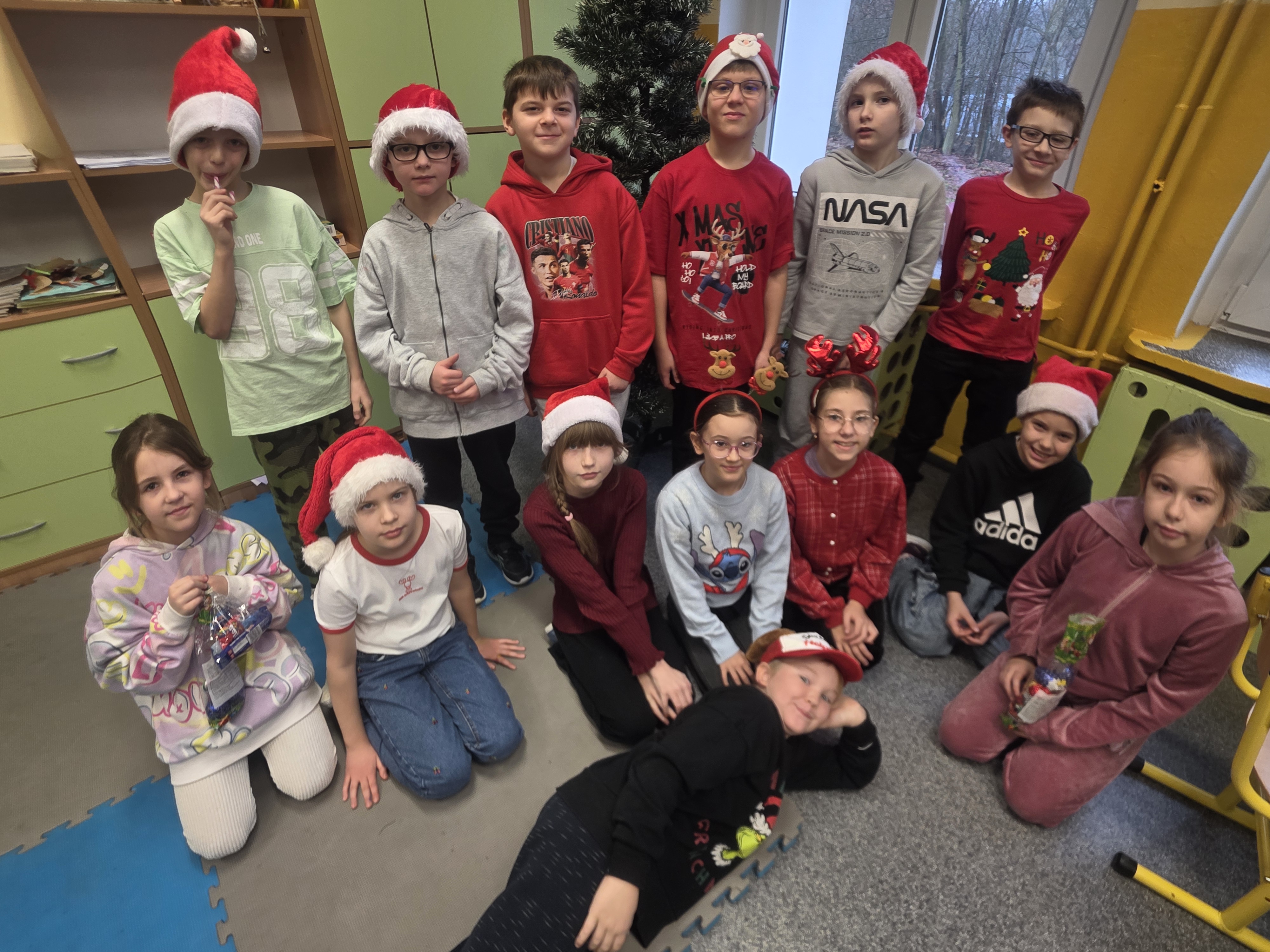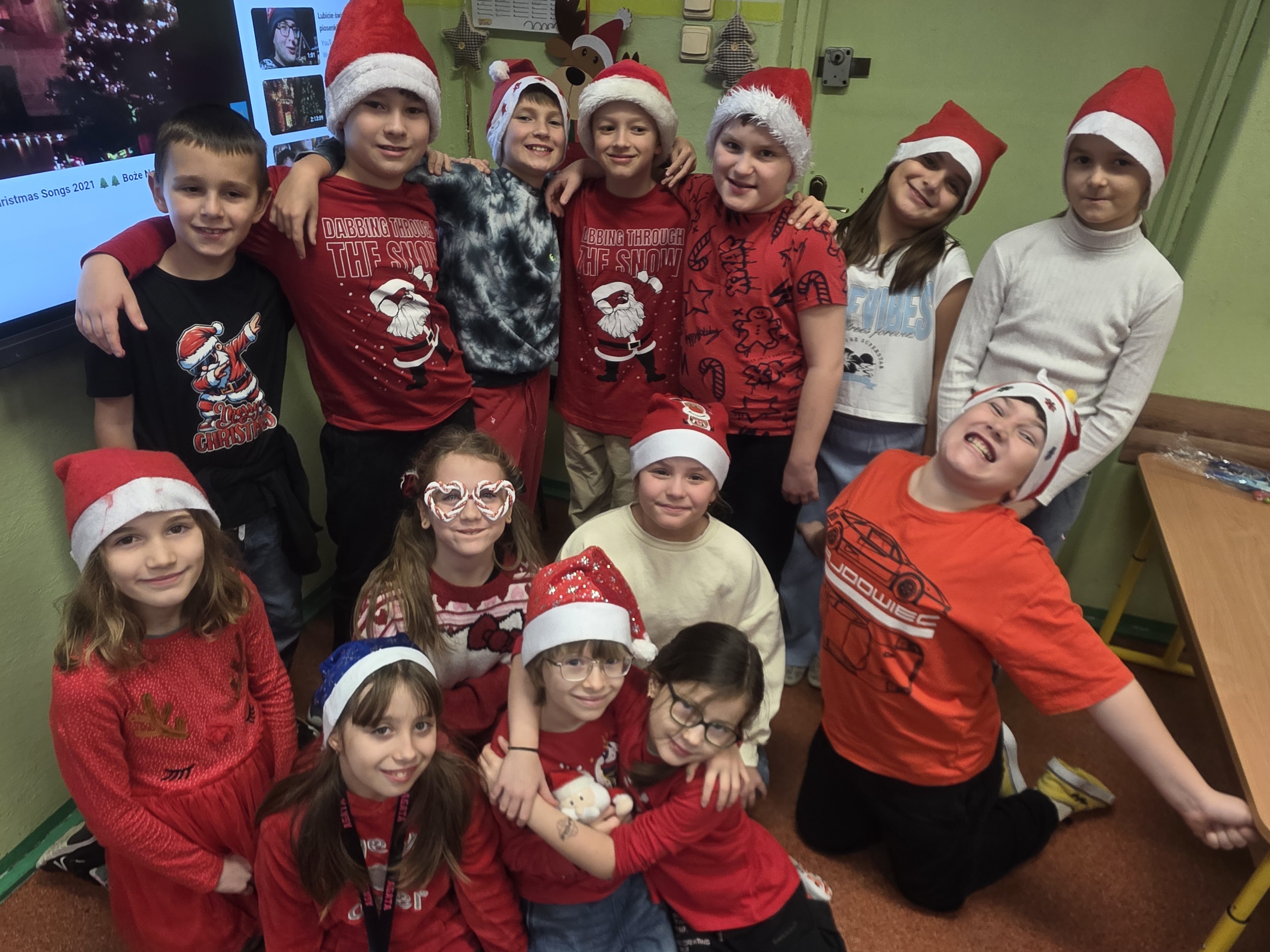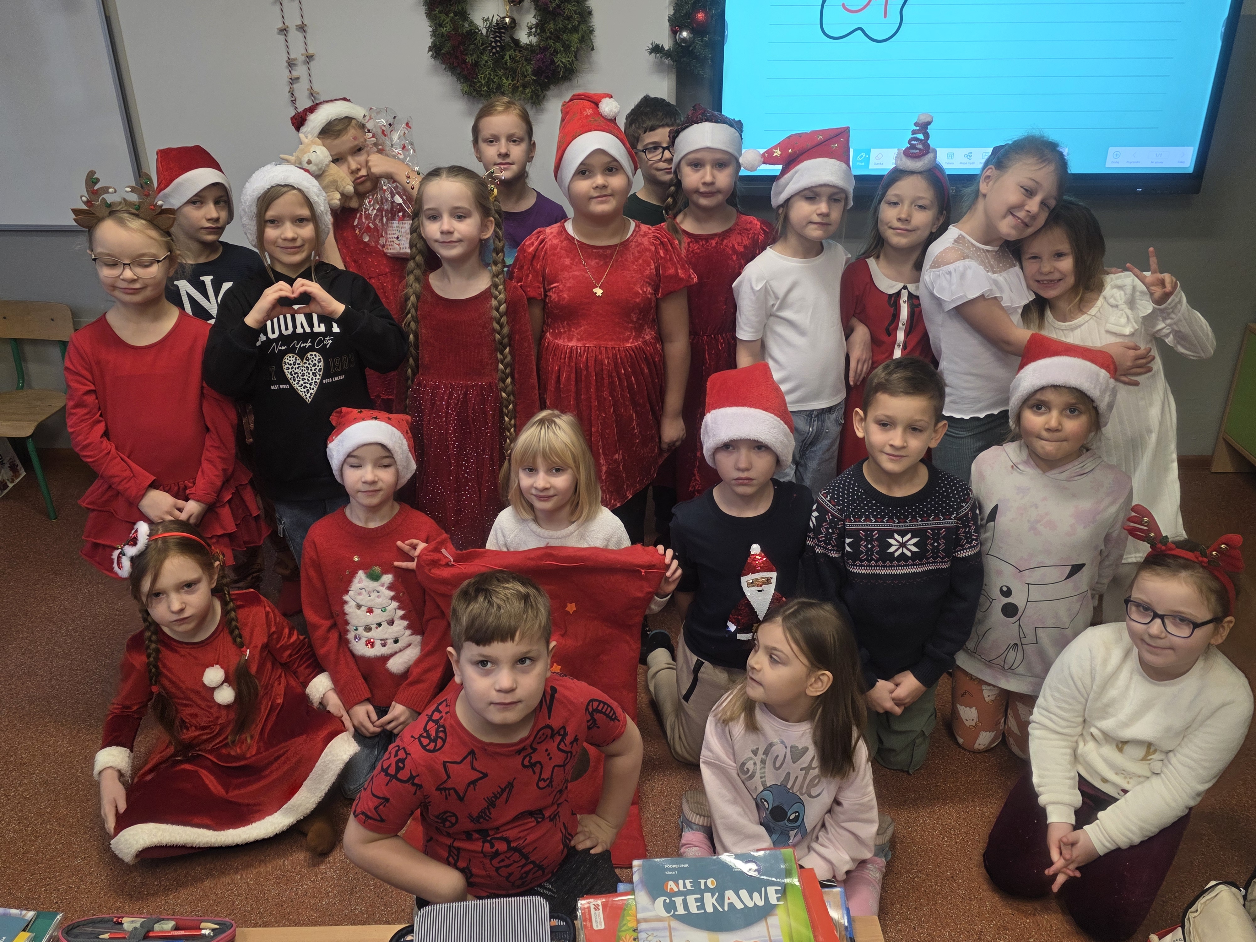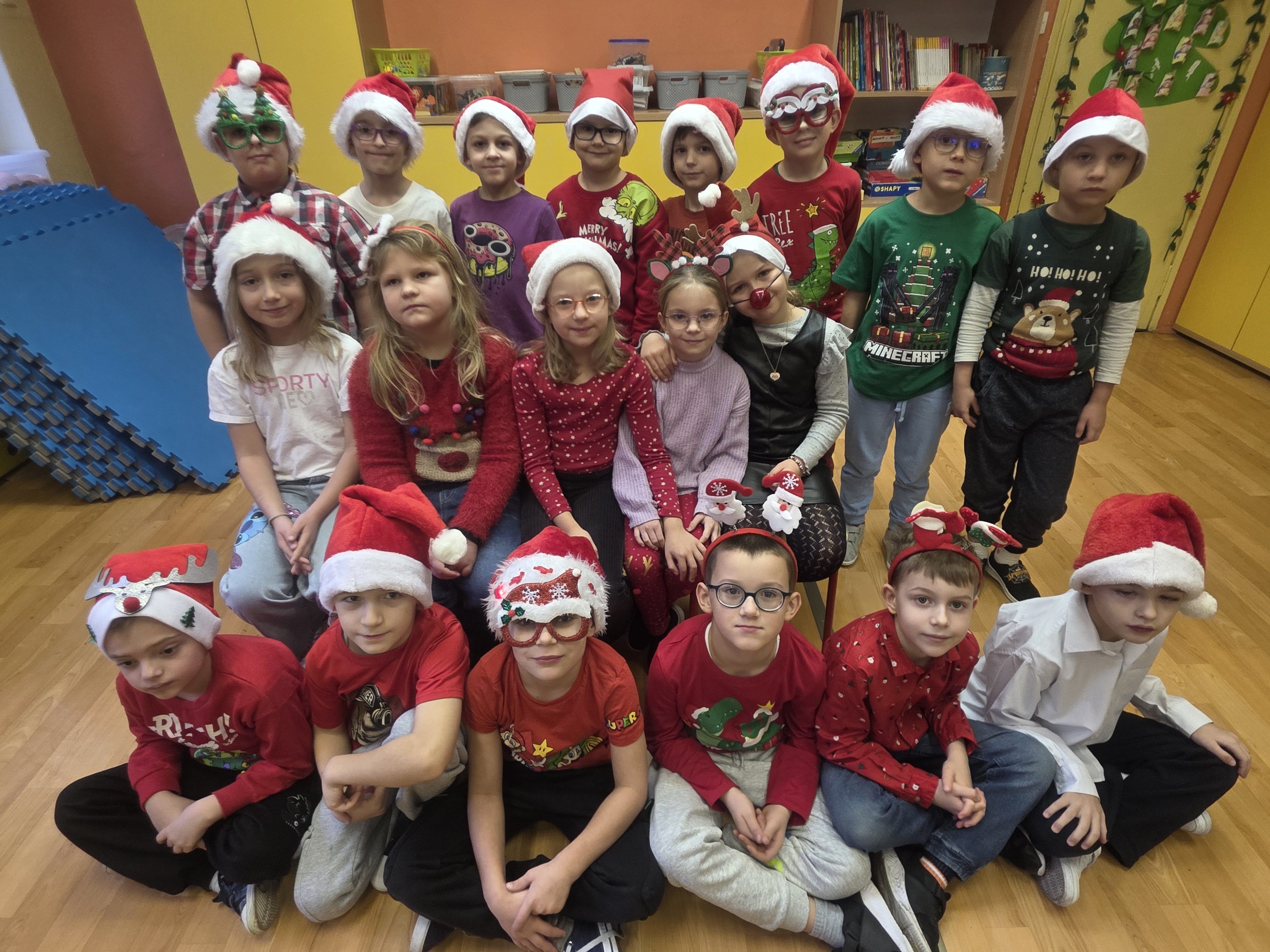 Dzieci bawiły się znakomicie – było mnóstwo uśmiechu, energii i wspólnej zabawy, a dzięki czerwonym czapkom i świątecznym akcentom św. Mikołaj na pewno nas zobaczył! Zgodnie z tradycją nie zawiódł i odwiedził nas wraz ze swoimi pomocnikami – aniołami i elfami. Jego wizyta wywołała wiele radości i zaskoczenia, a szkolne mury na chwilę zamieniły się w prawdziwą mikołajową krainę.