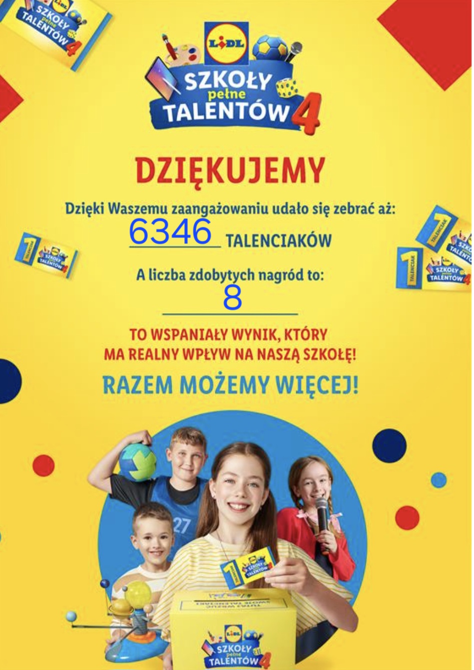 Nasza szkoła brała udział w akcji Talenciaki z Lidla, a dzięki ogromnemu zaangażowaniu i hojności rodziców udało nam się zebrać aż 6346 Talenciaków! Dzięki temu mogliśmy wzbogacić nasze wyposażenie sportowe, co pozwoli uczniom jeszcze aktywniej uczestniczyć w lekcjach wychowania fizycznego i nie tylko. Serdecznie dziękujemy wszystkim, którzy wsparli naszą szkołę - to Wasza pomoc sprawiła, że możemy jeszcze lepiej zadbać o rozwój naszych uczniów!